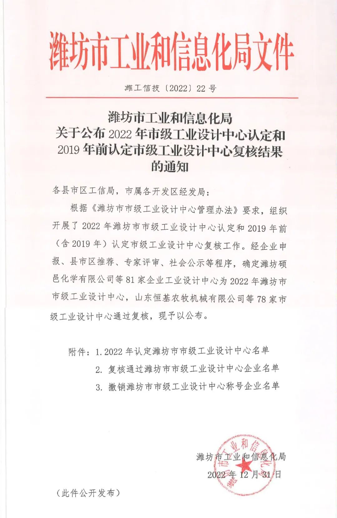 2022年12月31日,潍坊市工业和信息化局发布关于2022年市级工业设计中心认定和2019年前认定市级工业设计中心复核结果的通知,山东和创智云环保装备有限公司工业设计中心被认定为“2022年潍坊市市级工业设计中心”。